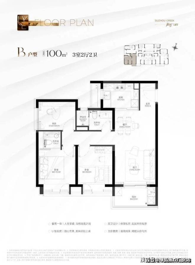 设计亮点:南北通透,全卧飘窗设计,三开间朝南(100㎡户型),层高3.0米,空间感强,私密性好