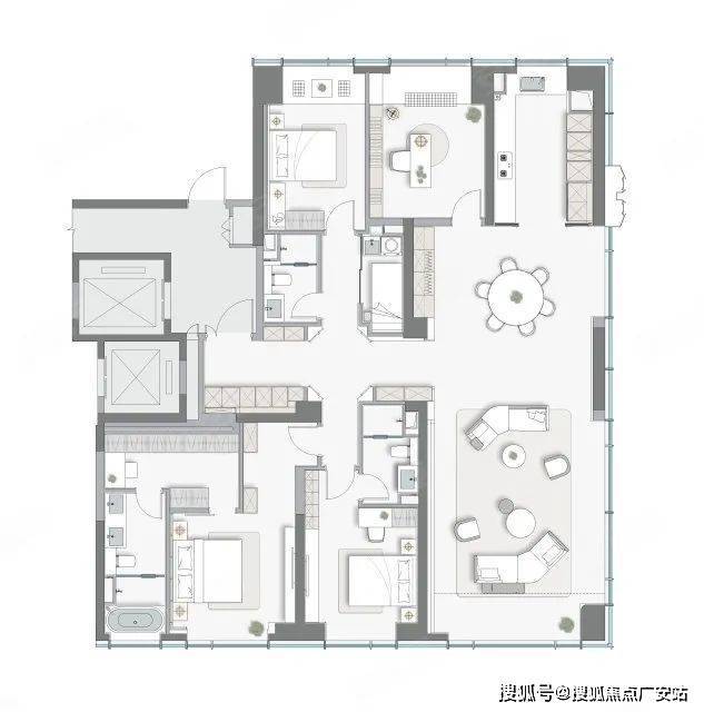 主力为精装修大平层,包括190㎡、220㎡、249㎡的四室两厅三卫户型,层高约3.15米,配备一梯一户、华为全屋智能系统及国际品牌家电。
