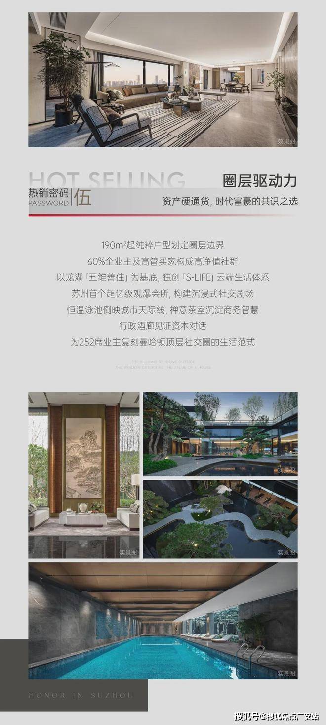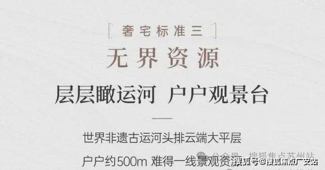 苏州唯一在售封面门户地标!苏州唯一一线靠古运河的高端全景住宅!苏州唯一拥有超五星级康莱德酒店配套高端住宅!苏州唯一高端住宅拥有滨水高端休闲商业配套!苏州唯一190㎡ 以上高端大平层,圈层纯粹!苏州唯一252套户户窗窗看运河的高端住宅!