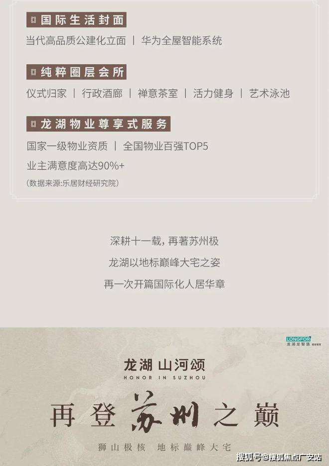 【项目核心价值点】狮山路核心CBD·最极致资源配套主城稀缺土地·终极置业地段运河文脉传承·绝版沿线住宅隐贵定制豪宅·极致稀缺平墅传奇综合地标·纵享国际生活国际巅峰大宅·纯粹公建立面豪宅龙湖品牌·深耕苏州11载国际一线臻装·隐奢细节雕琢亿级隐奢会所·康莱德行政酒廊钻石龙湖物业·康莱德增值服务