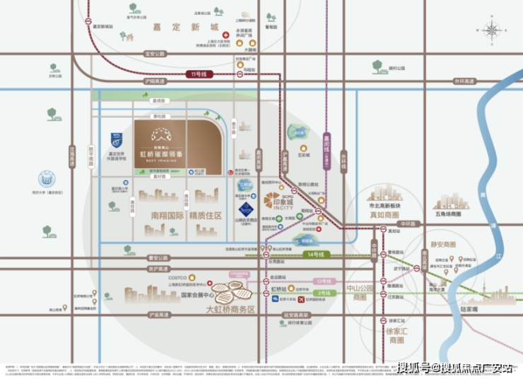 整个南翔板块区位优势明显:距虹桥核心区直线距离约13KM,享受大虹桥强势能级辐射。同时承接虹桥国际开放枢纽北向拓展带重要节点,一脉虹桥发展金线,南翔进阶大虹桥主城生活区,成为中央商务配套区和高品质国际化社区目的地。