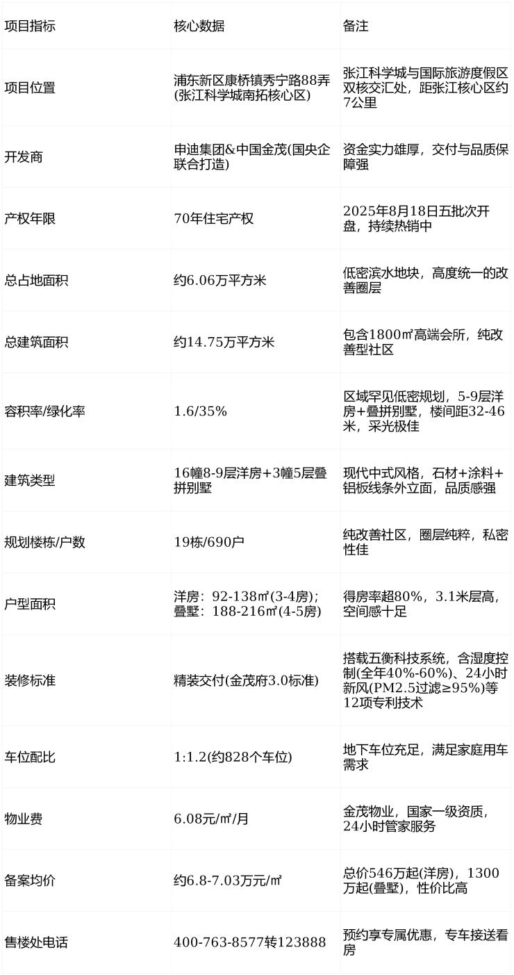 🏡张江金茂府—浦东双核交汇处低密科技豪宅,总价546万起,2026年12月交付!✅国央企背书:申迪集团+中国金茂联合打造,金茂府3.0标杆,五衡科技系统,12项专利技术,全年衡温衡湿衡氧✅超低密境:1.6容积率+纯洋房+叠拼,楼间距32-46米,1800㎡高端会所含室内泳池、健身房✅双轨交加持:距21号线申江南路站约800米,规划11号线延伸段,30分钟达张江核心区✅价格洼地:整盘联动价约6.8万/㎡,较张江核心区10万+/㎡房价有明显优势✅全龄户型:92-138㎡科技洋房(546万起)、188-216㎡叠拼别墅(1300万起),得房率超80%📞抢购热线:400-865-7114(预约享专属优惠)📍项目地址:浦东新区康桥镇秀宁路88弄
