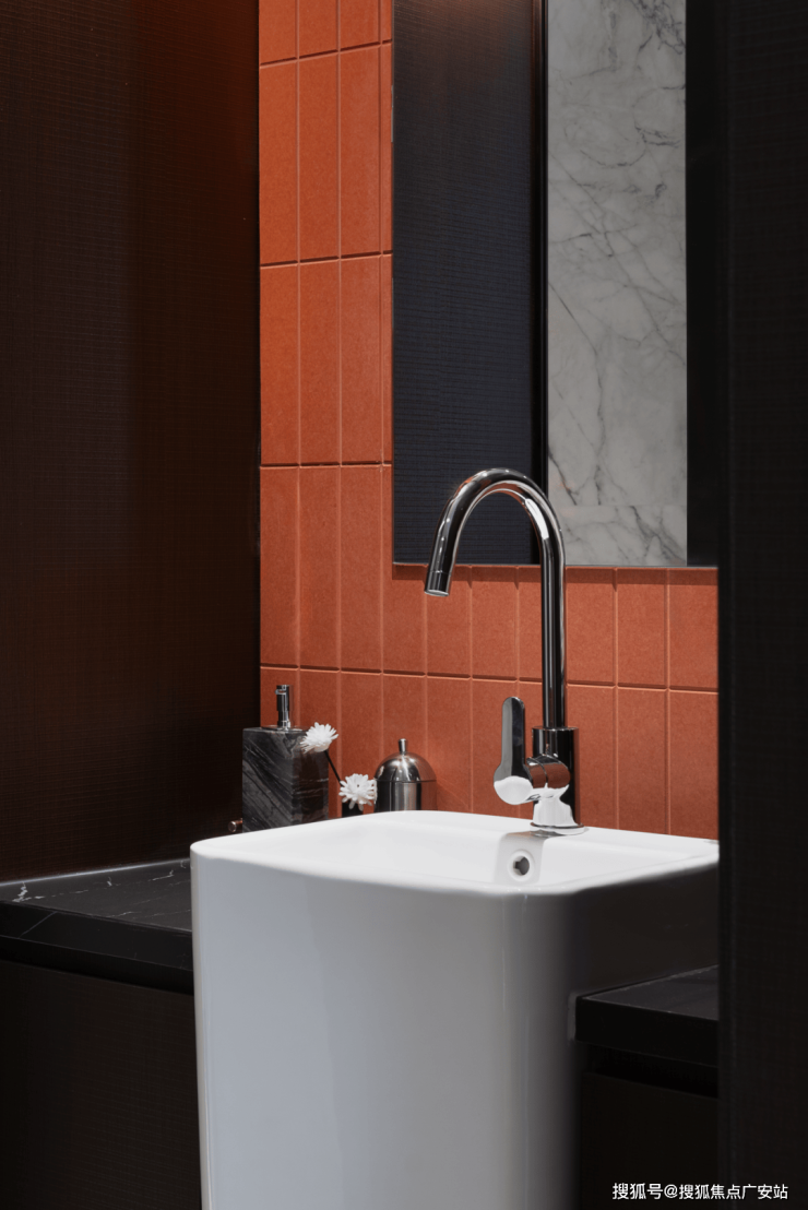 一面橘红色瓷砖墙面跃然其间