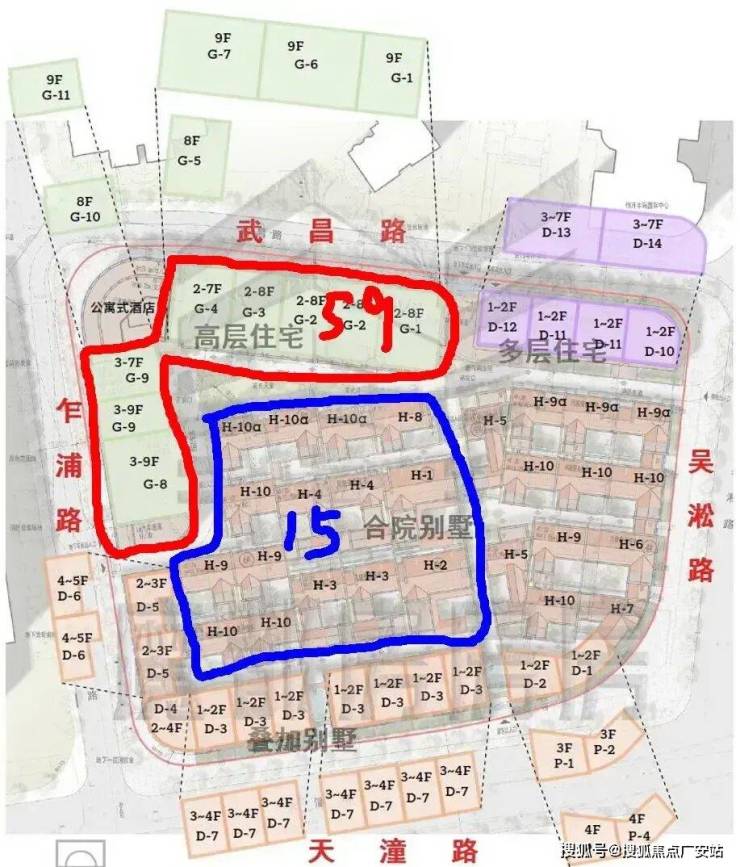 共125套住宅单元,从图示来看,全部是风貌住宅产品。以下为首开楼栋图示,59套小高层+15套合院别墅: