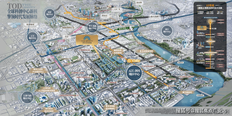 这座百万方滨水TOD大城,以15号线元江路地铁站点为核,从莲花南路到都会路整合片区,涵盖7大业态,约百万方大体量: