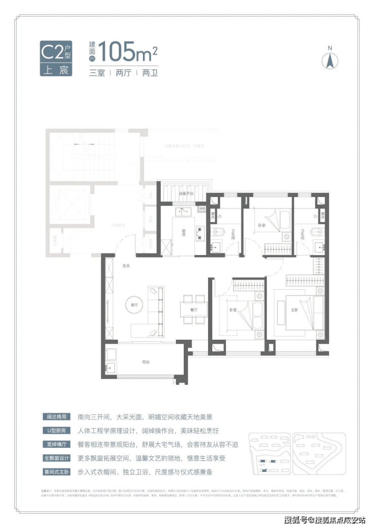 U型厨房、餐厅、客厅、阳台一线联通,南北通透。主卧套房、全卧飘窗、次卫干湿分离也都是标配。