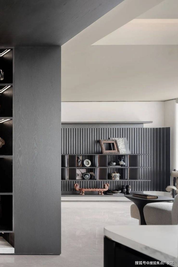 利落的线条与温润的陈设意趣相称,客餐厅与厨房以无缝拼接大规格岩板通铺地面,增加了空间的完整性。