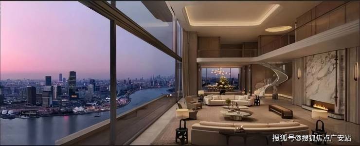 以270°三面环幕视野---南向约15米瞰江、东向纵览河园、北向拥揽世博园景,营造“阅尽千帆后的宁静”。