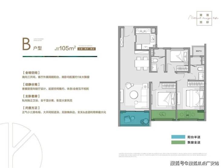 南向卧室均配置约1米大飘窗,赠送面积大的同时增加收纳空间;主卧套房设计,主人尽享私密。