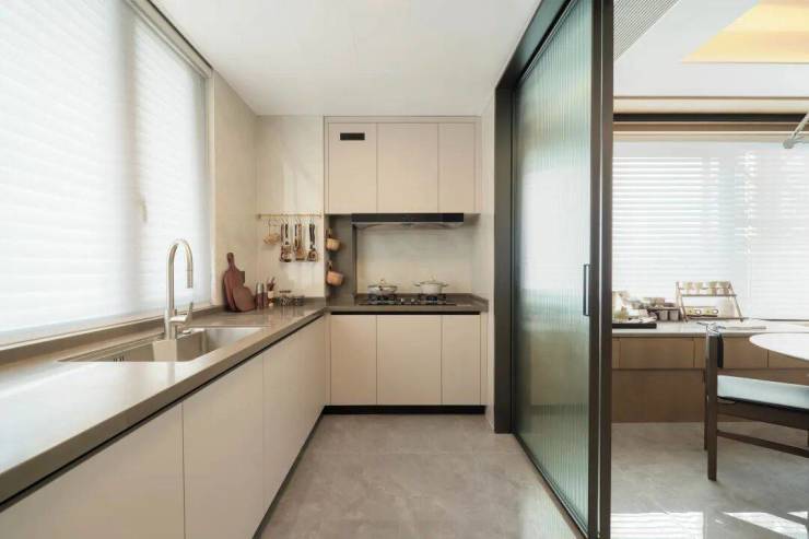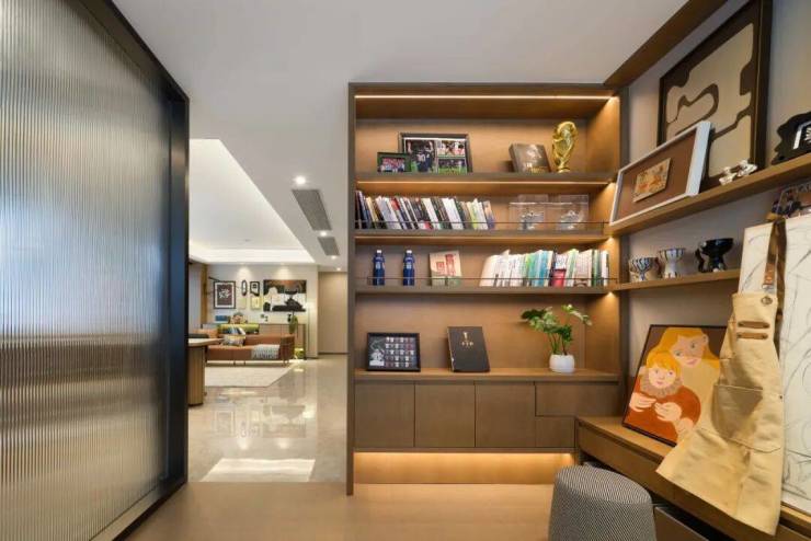 前排一线湖景楼幢,约12.4米超大面宽、四开间朝南。实体样板房的餐厅在做了双排餐边柜后,座位依然阔绰。厨房也非常自信的放入了双开门大冰箱,对喜欢屯各种生鲜食品、饮料的年轻人来说真是心头好。