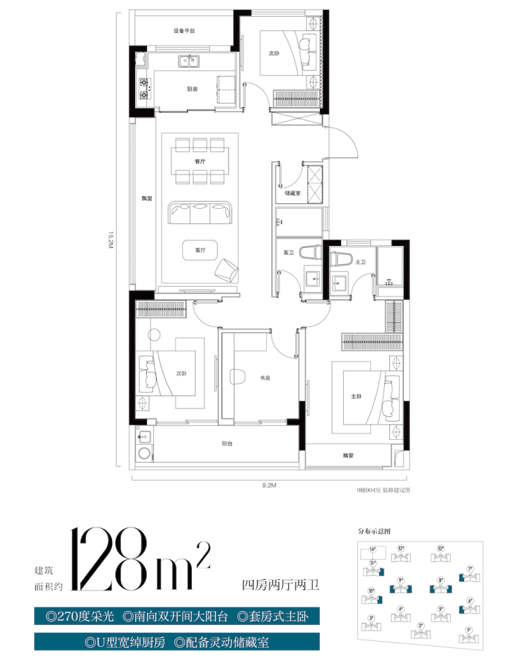 建筑面积约128㎡四房两厅两卫户型,采用“4+1”房设计,满足二胎家庭或三代同堂的居住需求,更比同类面积多了一个储藏空间。三房朝南,餐客厅尺度完全媲美140方以上户型,并且还有一个储藏间,非常贴近二孩家庭或者三代同堂家庭的需求。