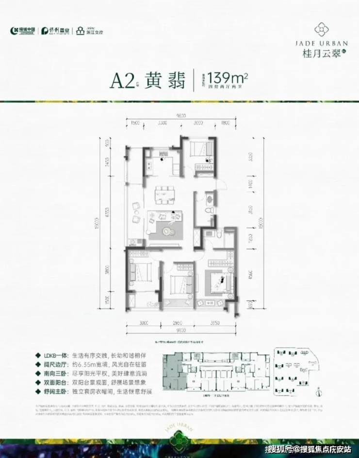 A户型:约139㎡户型, 四房两厅两卫,三开间朝南,全明边厅设计,大横厅带大阳台,采光视野好;三个卧室均朝南,带阳台或飘窗,面宽大、采光好;主卧大套间、阔绰收纳空间。是绿城过往的项目中难以见到的。 餐客厅一体,连带一个约 6.35m左右阳台,景观视野堪称一流。