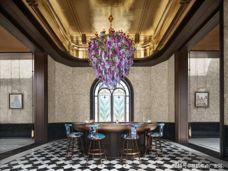其次,项目的很多细节都融入了海派经典元素,比如落客区美轮美奂的约300㎡彩色玻璃穹顶,艺术连廊拱形廊道灵感都来自和平饭店。彩绘花窗的拱门造型则取自武康大楼。