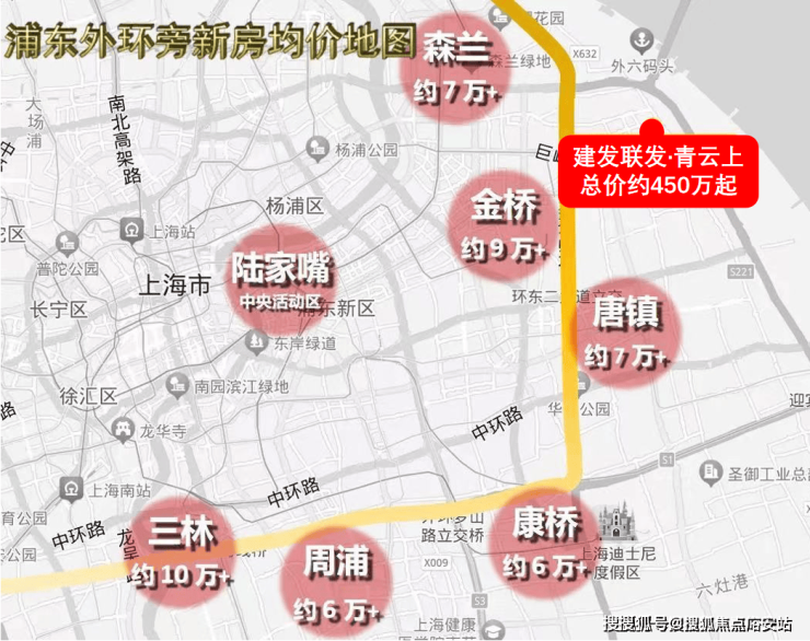 「建发联发·青云上」直线距离外环仅约3公里,通过北侧的五洲大道可直抵中环。在目前浦东外环旁区域的新房价格体系中,三林约10万+、周浦约6万+、康桥约6.6万+、唐镇约7万+(来源:根据网上房地产公示数据整理)。从区位上来看,该项目可以匹配约600-1000万才有的地段价值。