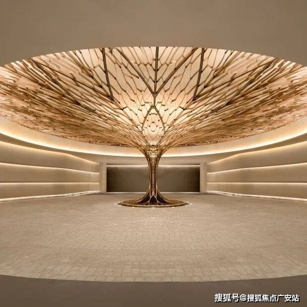陶砚176㎡户型:取陶砚之自然璞实感,雕琢白冰玉的背景墙,客厅吊顶还原砚台造型,室内饰以瘦金体笔划装饰线条。