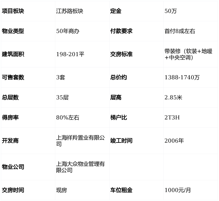 50年商办产权,建筑面积198-201㎡,总价1388万起,2梯3户设计,层高2.85米,得房率80%,南北通透三面采光,附带三阳台,通燃气,水电煤费用亲民6。