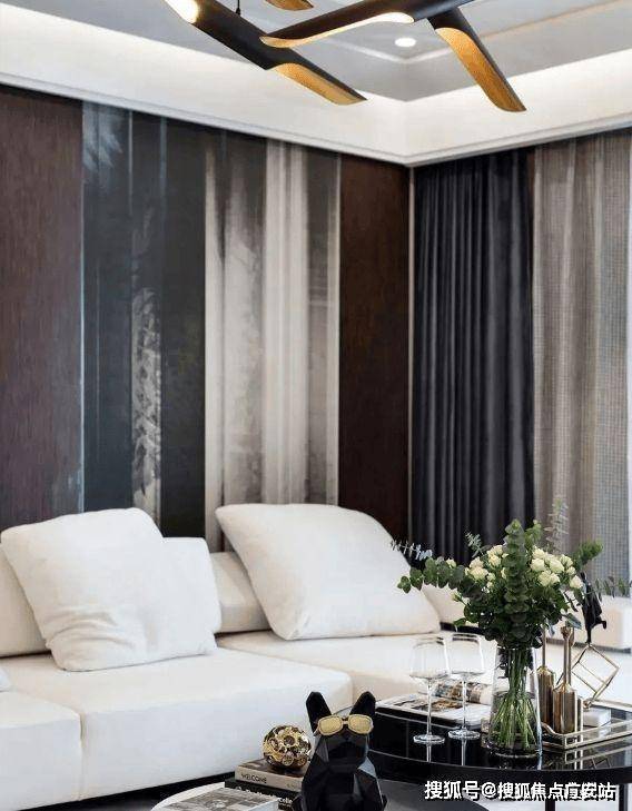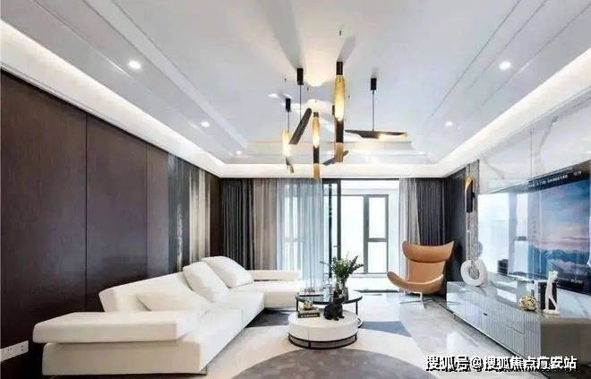 客厅设计简洁明亮,通透大气。无主灯的吊顶,结合白色的家具,上下呼应,和谐统一。深色的背景墙,给空间注入了一股摩登的氛围,造型独特的吊灯,彰显个性的空间氛围。