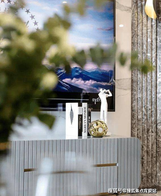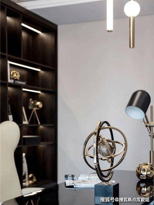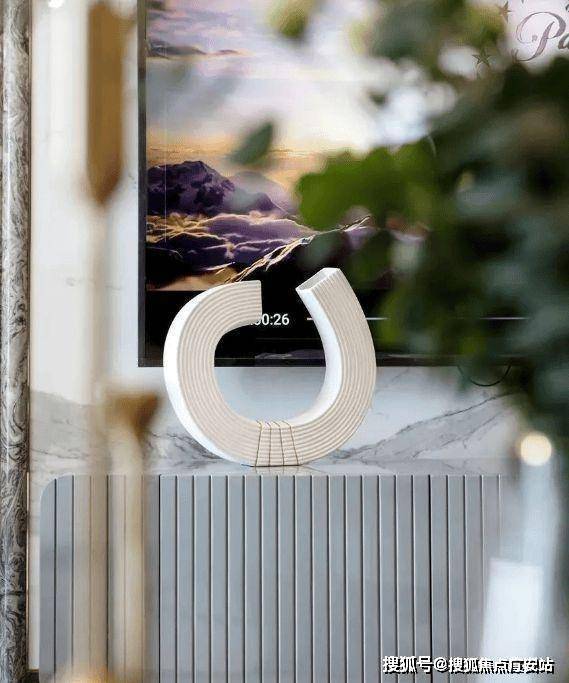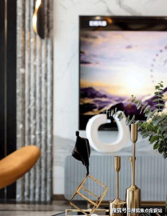 茶几上摆放着黄色金属的工艺品,通过材质的造型和线条,让空间显得更有设计感,同时也凸显出空间主人的精致和时尚。