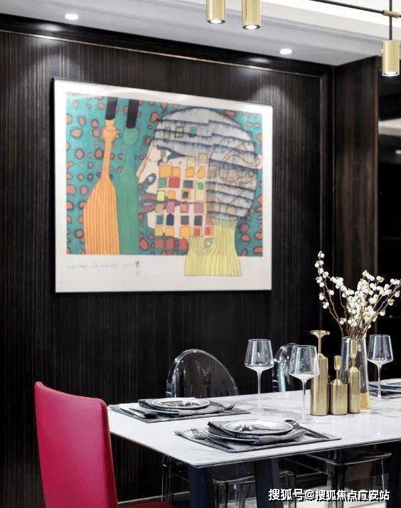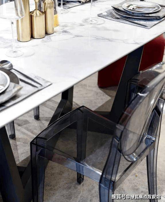 黑白对比的餐桌,几何的线条让氛围显得更加沉稳。为了更加贴合主人的生活习惯,除了红色座椅之外,还搭配了灰色透明的座椅,表现出空间主人对时尚的追求。