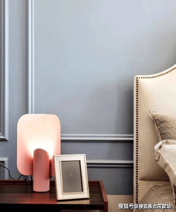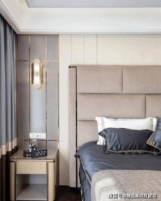 精致镂空床头柜,金属元素的点缀和背景墙金属线条形成呼应,用来营造空间的轻奢质感。