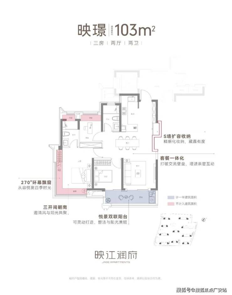 建筑面积约103㎡三房两厅两卫,不失为改善家庭的首选。其中边套户型,映江润府的主卧套房做了 270°环幕飘窗,实现无与伦比的采光通风和视野享受,类比于千万级豪宅的体验!