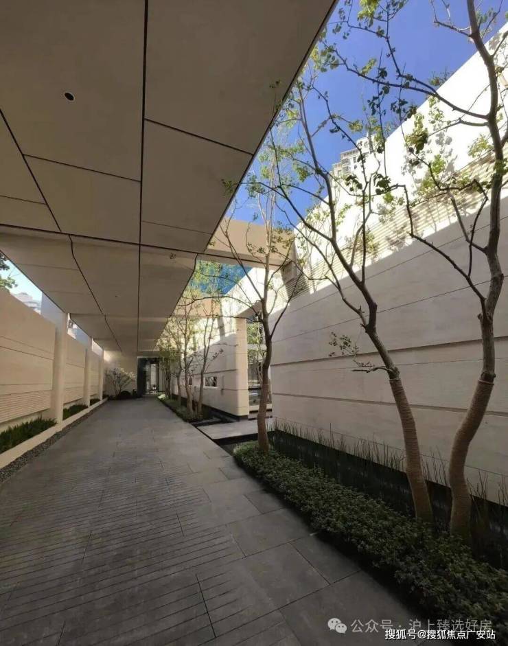 造景的用料也同样考究,大门景墙选用工艺复杂、用料扎实的沙漠风与白海棠石,风雨连廊选用了经过多轮艺术工艺抛光打磨形成的哑光荔枝面的沙漠风石。