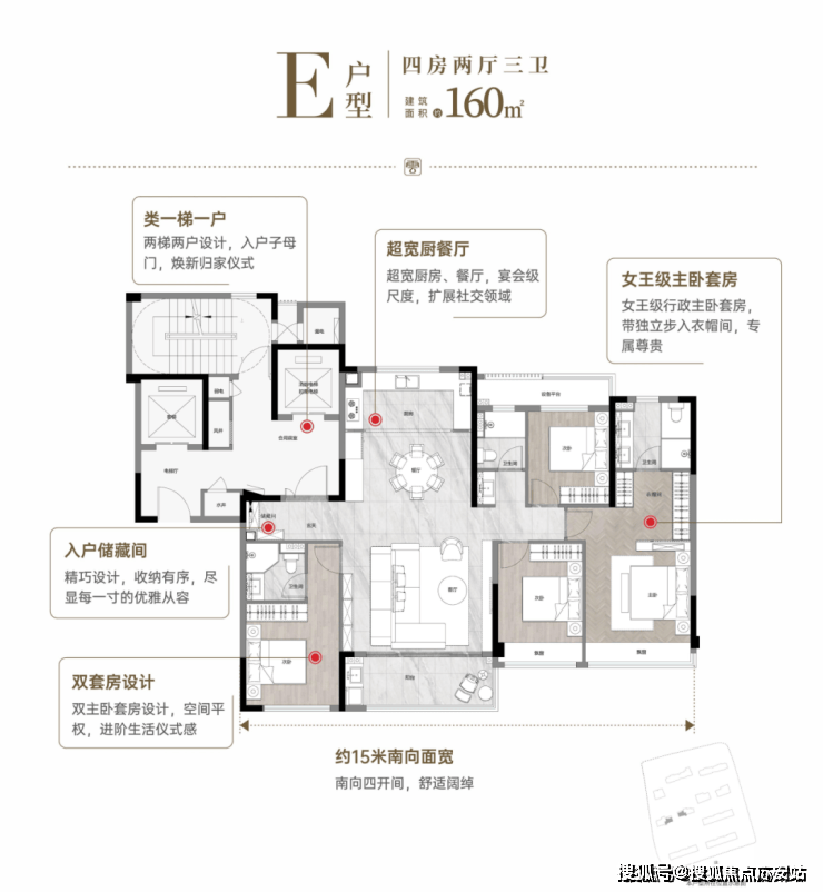 160㎡户型,1T1户设计,高配臻质四房+双套房,星级酒店级体验皆是日常;LDKB一体化设计,南向约15米四开间大面宽,约4.4m面宽餐厨厅,可轻易摆下圆桌+餐边柜组合,奢享宴会级空间,完美诠释了近200㎡的空间享受。