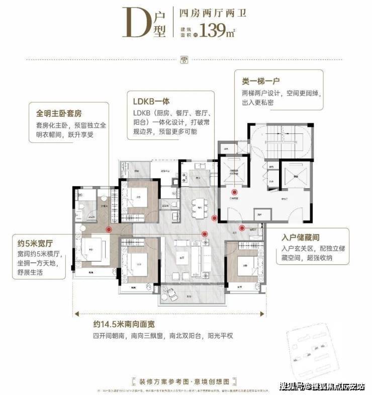 建面139㎡户型,客厅超5米的南向四面宽,大开间短进深设计,主卧带L型转角飘窗,独立全明衣帽间,尊贵感强。建面约160㎡户型南向超15m,四房三卫格局,L型步入衣帽间,更好的私密感。