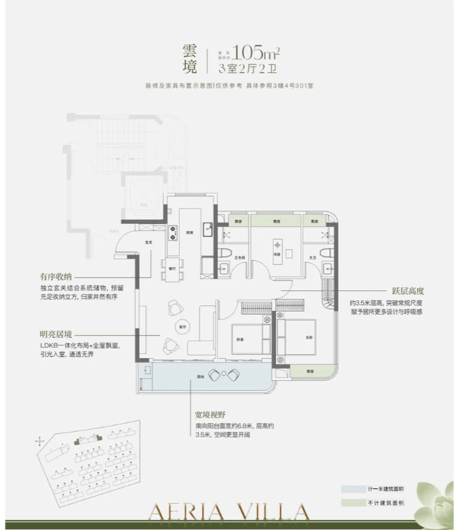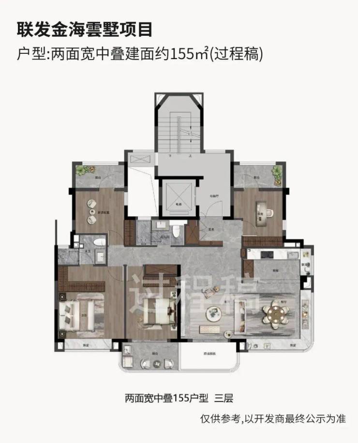 约112㎡3+1房两厅两卫:层高3.05m,南向面宽约11m,总价680-720万;