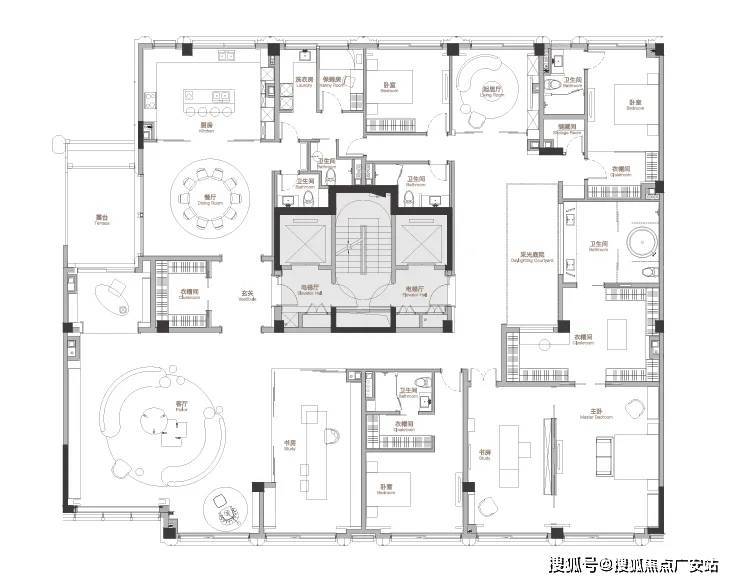 一期可售的户型面积集中在458-641㎡。当风貌平层户型尺度做到这个层面,其实户型本身已经无可挑剔了。仅说个细节,一期风貌平层中,做了罕见的做了两梯一户配置,主佣分离很好地保证了业主的隐私性和动线。