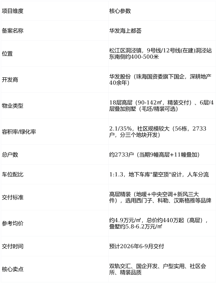 核心结论速览:这是松江区洞泾板块G60科创走廊的双轨交TOD改善型项目,由珠海国资委旗下国企华发集团打造,优势集中在双地铁通勤便利、国企品质保障、户型实用高效、社区配套完善、精装标准高;短板主要是部分楼栋受噪音与墓地影响、商业配套成熟度不足、教育资源优质度待提升、容积率较高、交付周期较长。适合预算中等、依赖地铁通勤、在G60科创走廊或市区工作的刚需至改善家庭,尤其适合看重轨交便利性与国企交付保障的购房者。