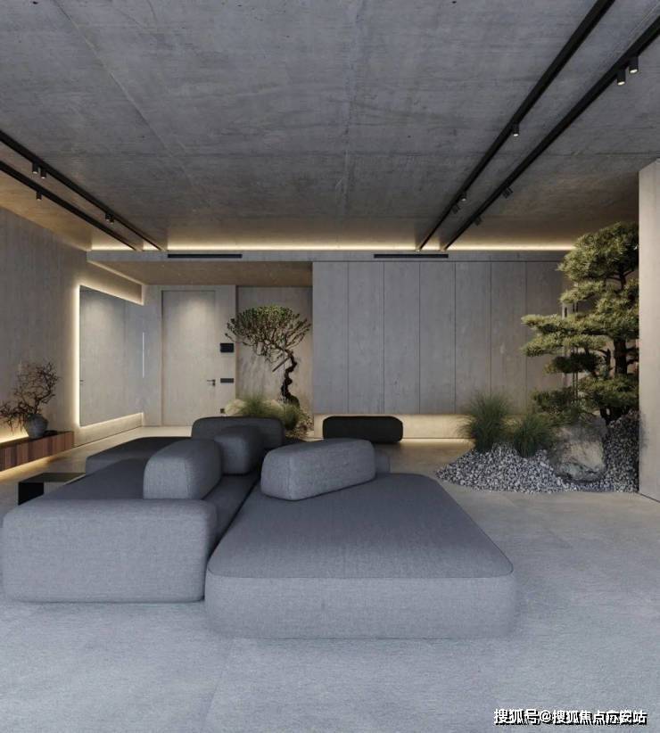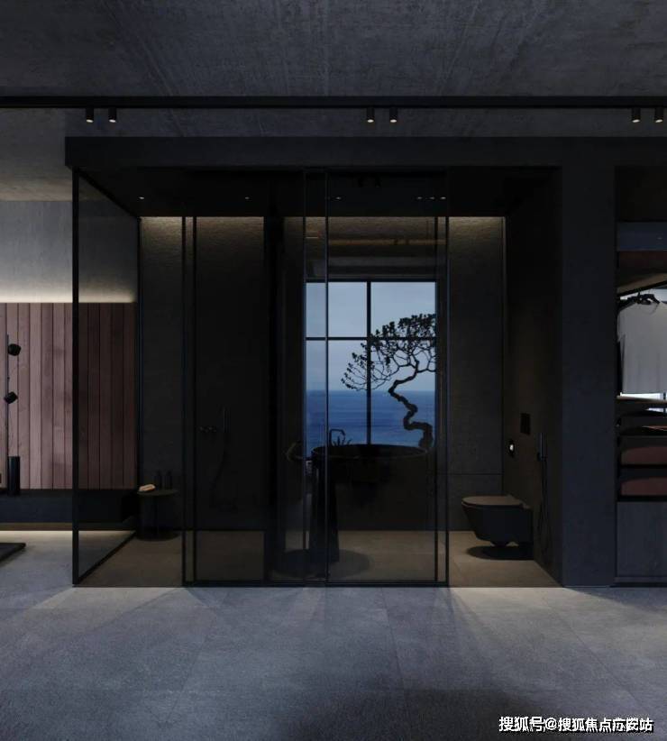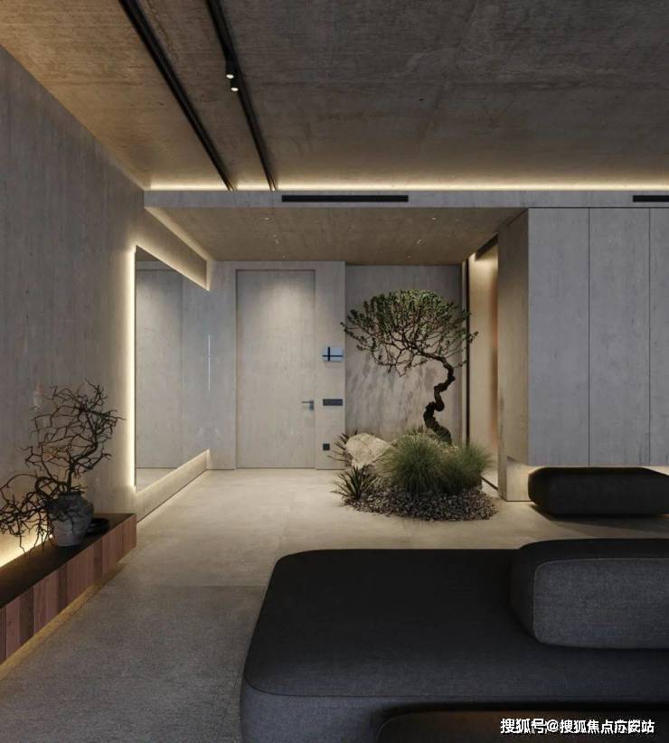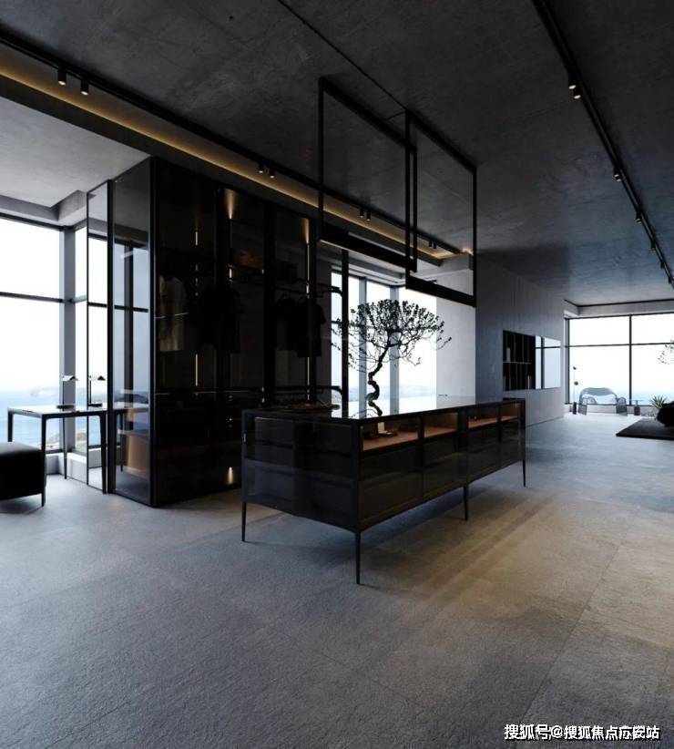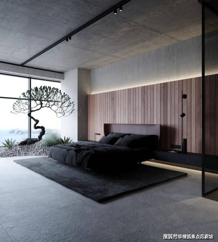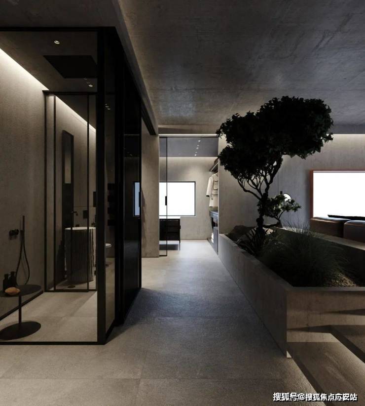简约的风格和沉稳的黑色调相结合,搭配气质非凡的松树更能凸显出空间内部的纯粹感。