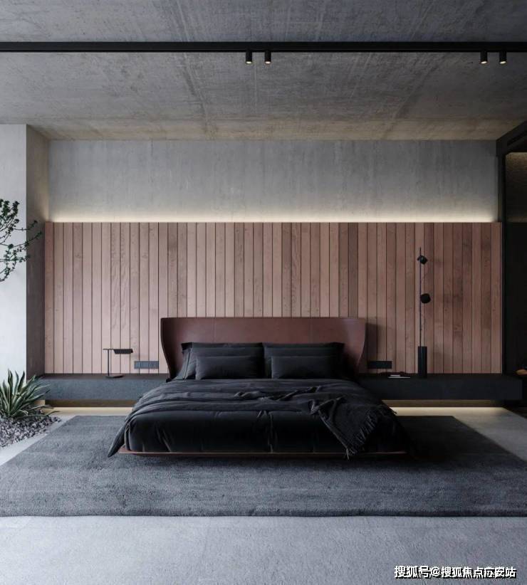 卧室作为一个私密空间,背景墙延用了与厨房一致的原木背景,让整体空间更具安静沉着的气息。