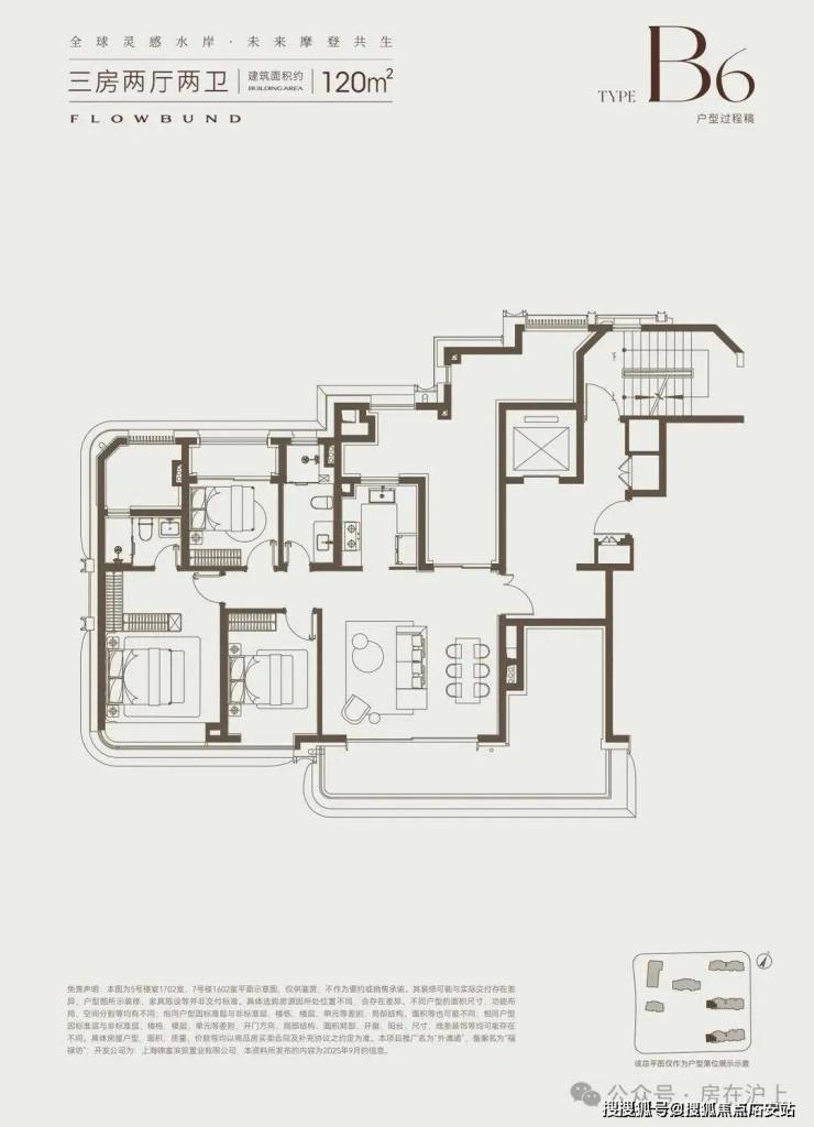建面约120㎡3房2卫户型