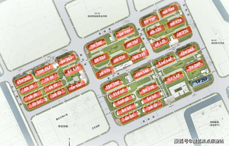 根据公示图显示,该项目的4个小板块最高层为项目东南角和西北角的26层高层,共有6栋,高度接近地块限高的80米(77.80米);18层的共有8栋;17层共有6栋;14层共有4栋;13层共有2栋;6层的共有4栋;5层的共有8栋。