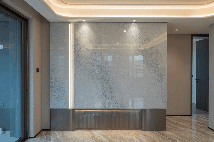 此外,还有五款玉之名岩板,如架空层迎宾&首层大堂背景岩板「黄龙玉」、酒廊吧台岩板「蓝翡翠」、电梯轿厢背景岩板「珍珠玉」、入户门装饰岩板「威尼斯棕」、室内客厅背景墙岩板「珠光宝气」等。