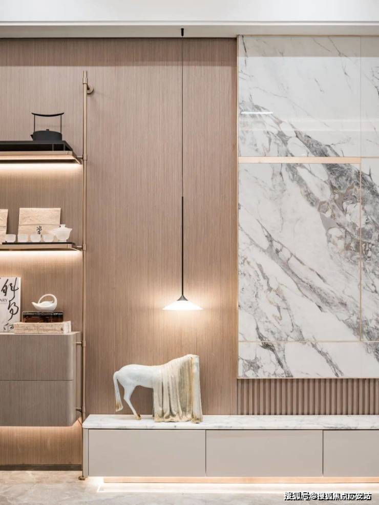 精选钢木复合门、臻选雅艺壁布、自然木饰面、全景一体化岩板背景墙等精奢材质,搭配充满仪式感的氛围灯带、打磨移门、踢脚线、过门石等每一处细节。