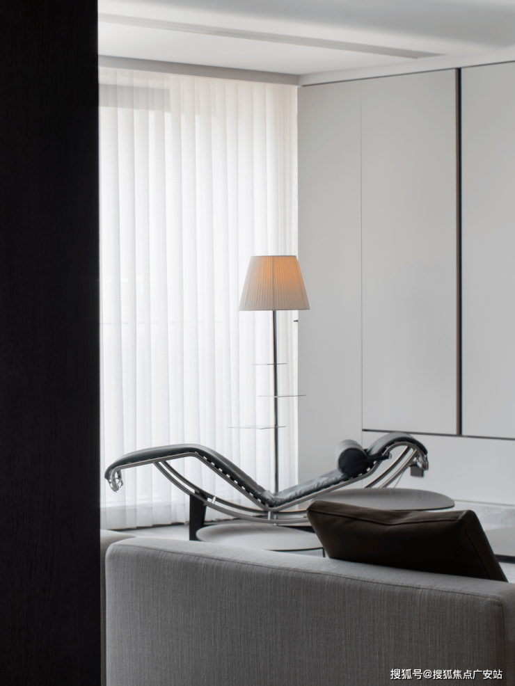 在靠近落地窗的绝佳位置,一把黑色躺椅静静伫立,午后暖阳毫无保留地倾洒而下,让这份独处时光变得格外温暖惬意。