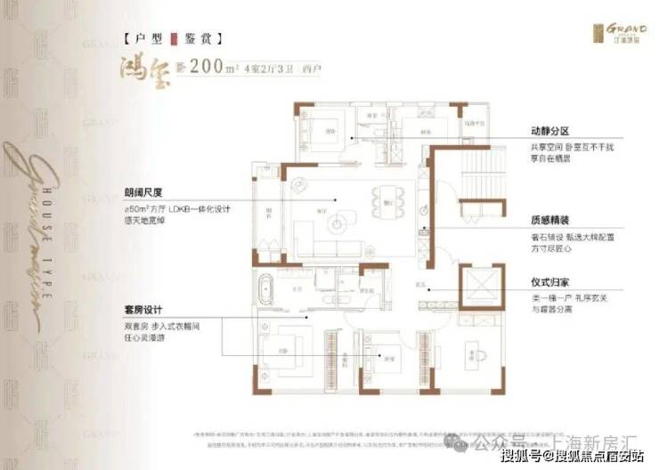户型为建面约200㎡4房3卫大平层。江湾鸿玺售楼处电话:400-887-5663✔✔(售楼处最新电话)