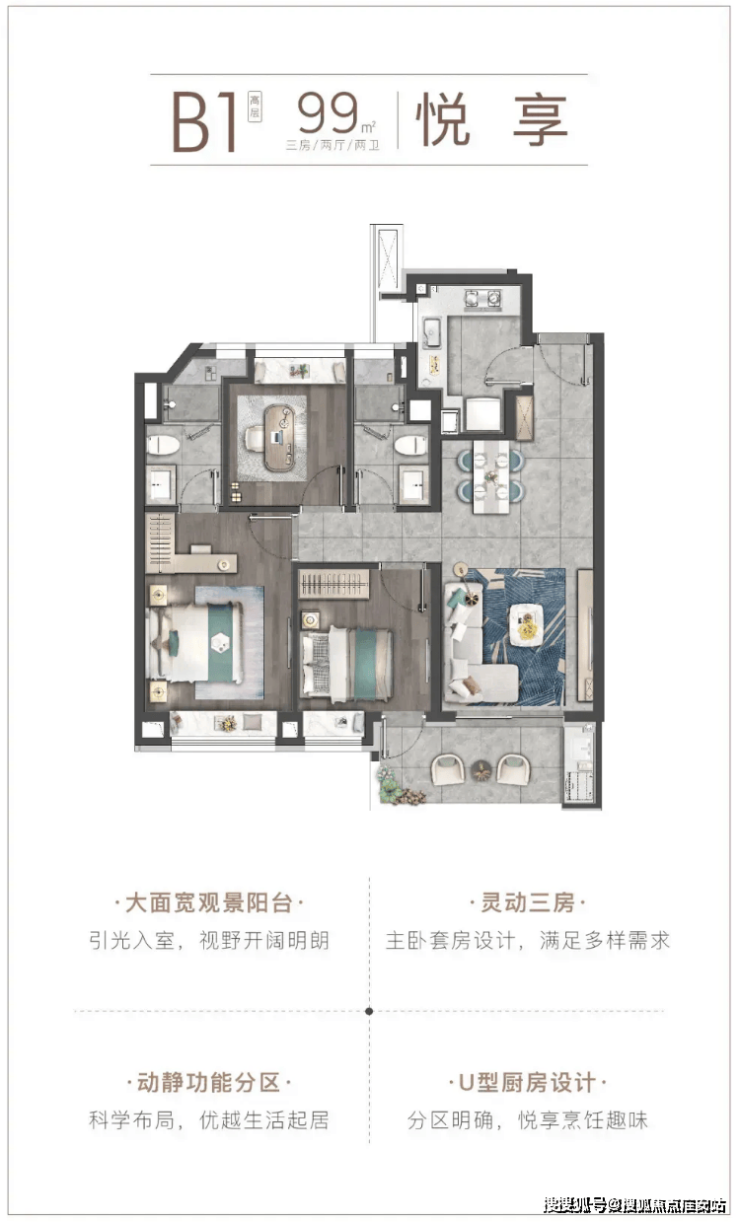 高层99㎡三房两厅两卫(中间套)样板间户型