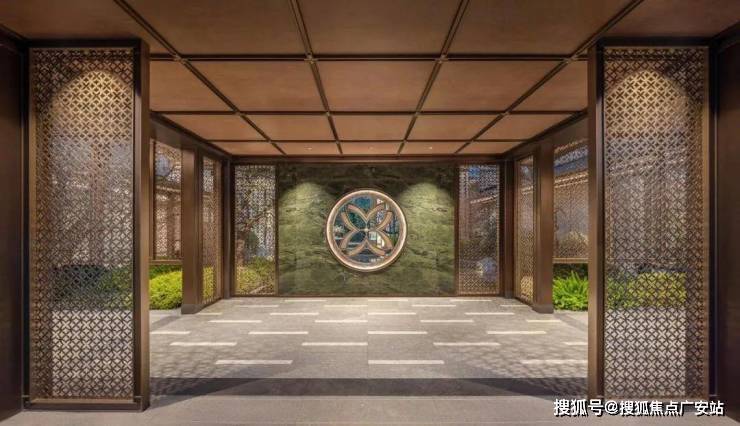 采用“王府中式”设计,大门为歇山顶形制(宽53米、高近11米),配黄铜狮、罗汉松及蓝翡翠奢石。园林融入西湖十景元素,如“花港观鱼”水景、“柳浪闻莺”绿植,并设雾森系统首层单元门厅石材铺就,肌理沉稳。