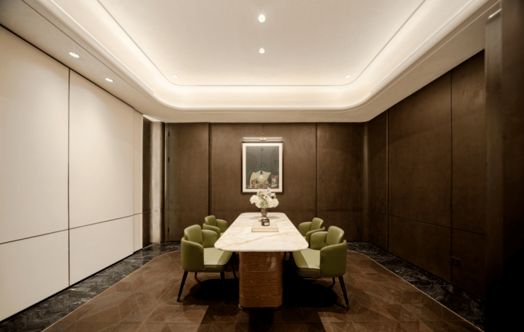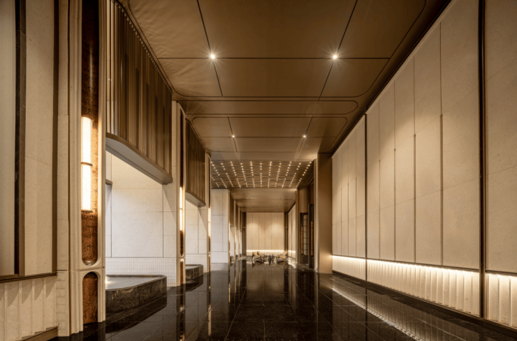 室内墙面大面积铺设温润质感的木饰面,墙面转角处采用曲面处理,为空间注入温馨舒适的居住氛围。
