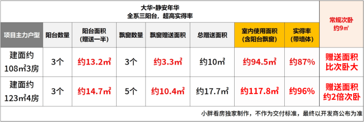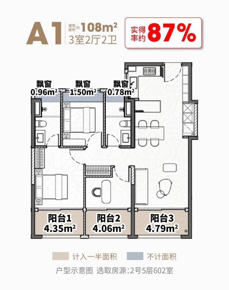 建面约108㎡3房,三阳台面积达约13㎡(赠送一半),飘窗赠送约3.3㎡,室内使用面积达约94.5㎡,实得率高达约87%,总赠送面积比常规次卧都大。