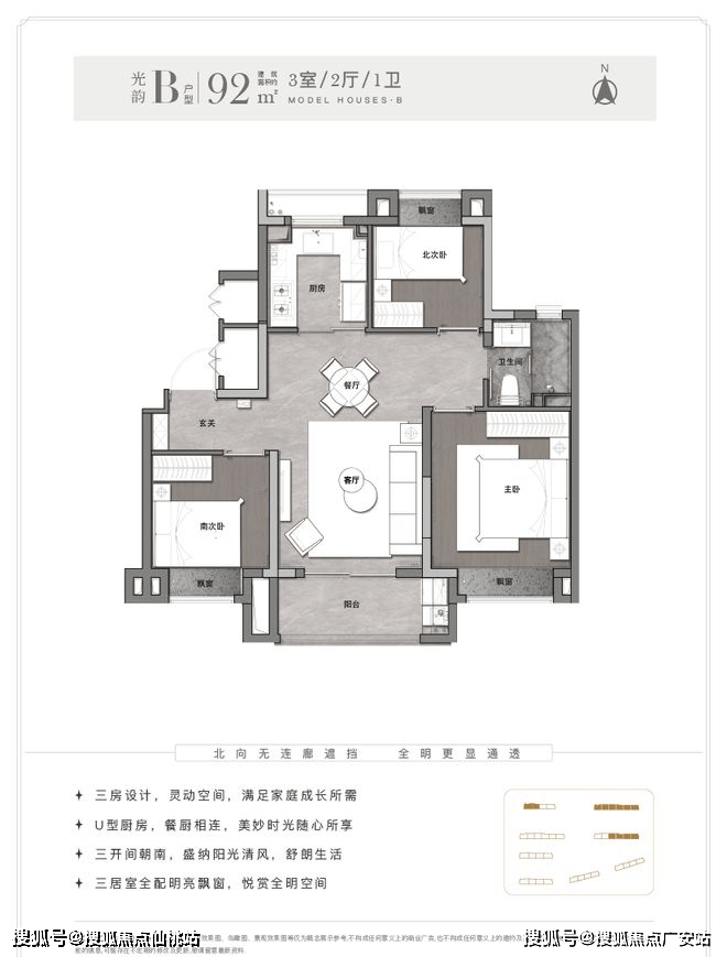 建面约92㎡3房,三开间朝南飞机户型,南向总开间约10.1米,南向主卧和次卧分布在客厅两侧,保证了私密性。