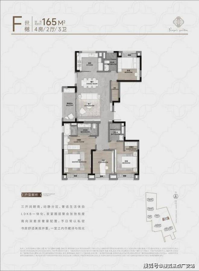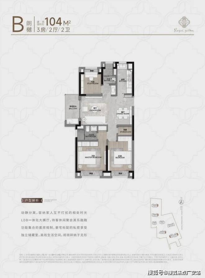 104㎡3户型特点:该户型多为楼栋的东边套,是一个观景户型。客厅连接270°阳台,视野出众。双卧朝南,阳光满溢。从次卫布局看,如果家庭人口较少,该户型还能做成双套卧。