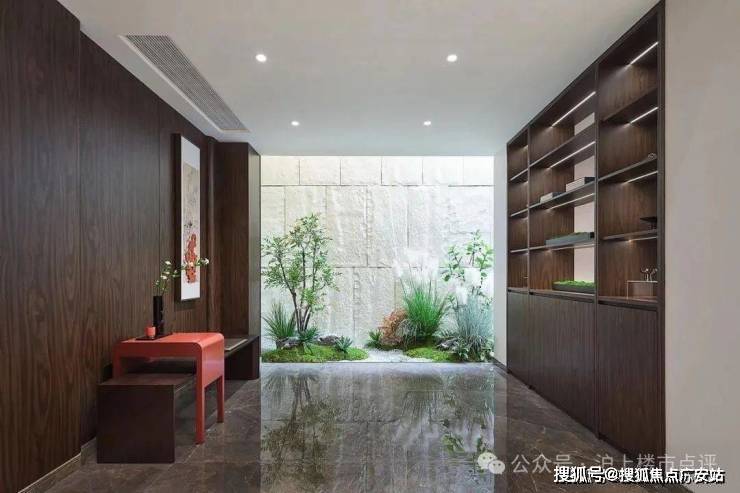地下空间,以古时的「雅集」为灵感,打造了一个氛围柔和舒适的休闲娱乐空间,挑空的设计,让空间显得大气非凡,顶面延续了之前紫禁明月中的方格金箔顶,墙面的大块水墨玉石,宛若矗立山林间。