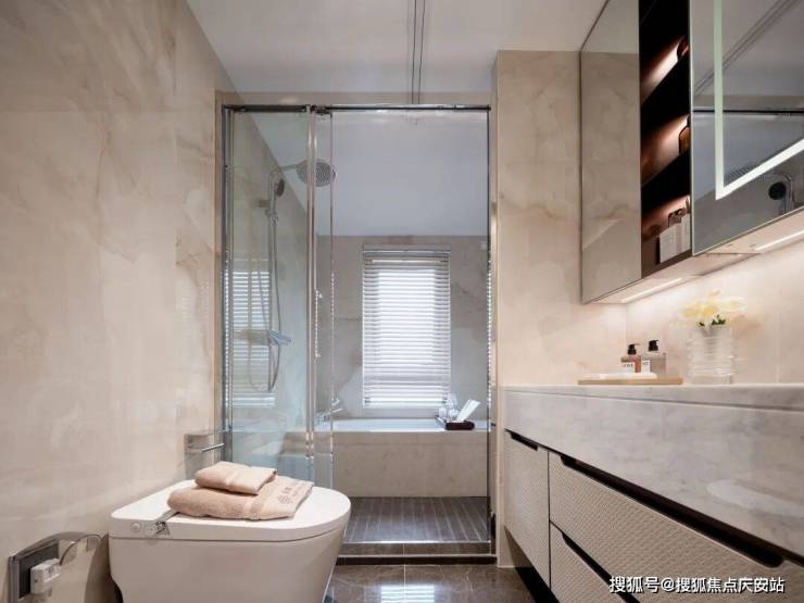 主卫的墙板选用仿玉石岩板,浴缸台则采用奥特曼米黄大理石包裹,而次卫则搭配了芬迪白岩板等材质,每一处细节都体现了对高品质生活的追求。