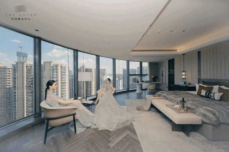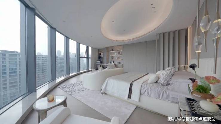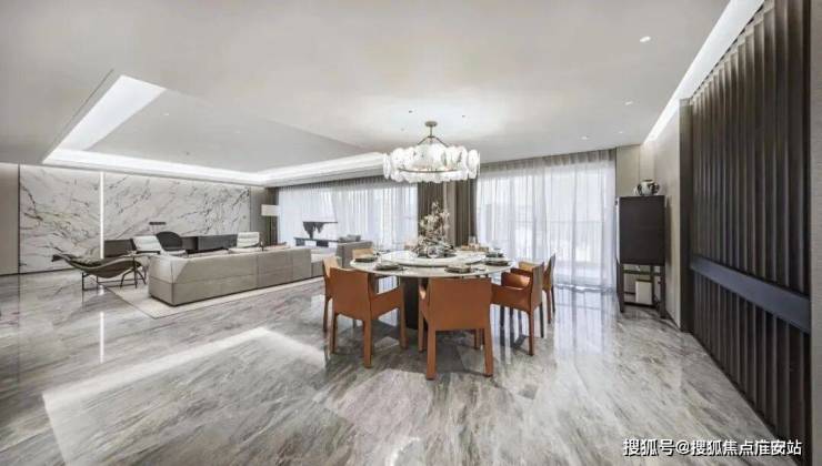 约450㎡“香奈儿”西边套,将原本多见于餐桌和墙面的白金沙奢石,漫铺于双厅地面之上。浅淡得宜的洁白,温润如玉的蜜色,将空间衬得时髦优雅。能眺望钱江两岸的梦幻天际线,“宇宙中心”奥体尽收眼底,也能俯瞰城市霓虹,车水马龙就在脚下。整个中心的璀璨世界定格在落地窗前,像一张巨幅明信片。