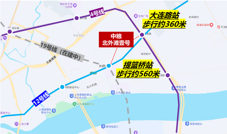 交通方面:项目周围环绕三条地铁,步行约360米到4、12号线大连路站,步行约560米到12、19号线(在建)提篮桥站。