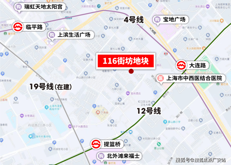 交通方面,项目位于上海内环内,距离轨交4号线大连路直线距离约250米,周边4、12以及在建19号线三轨交汇,交通便捷。